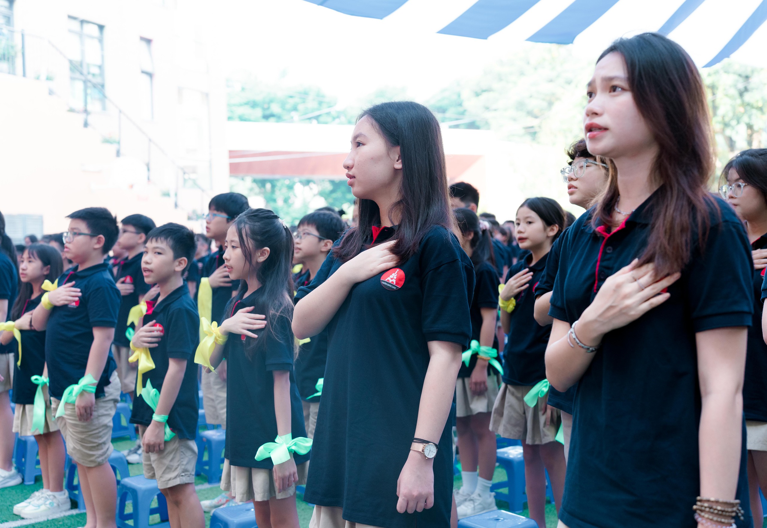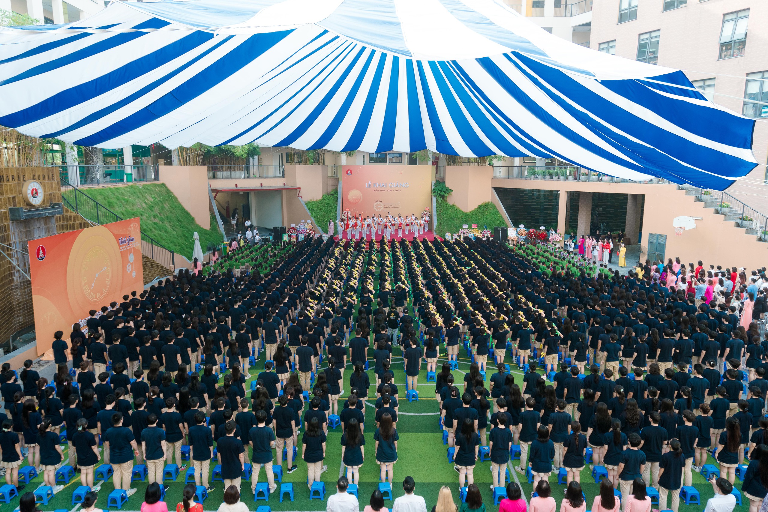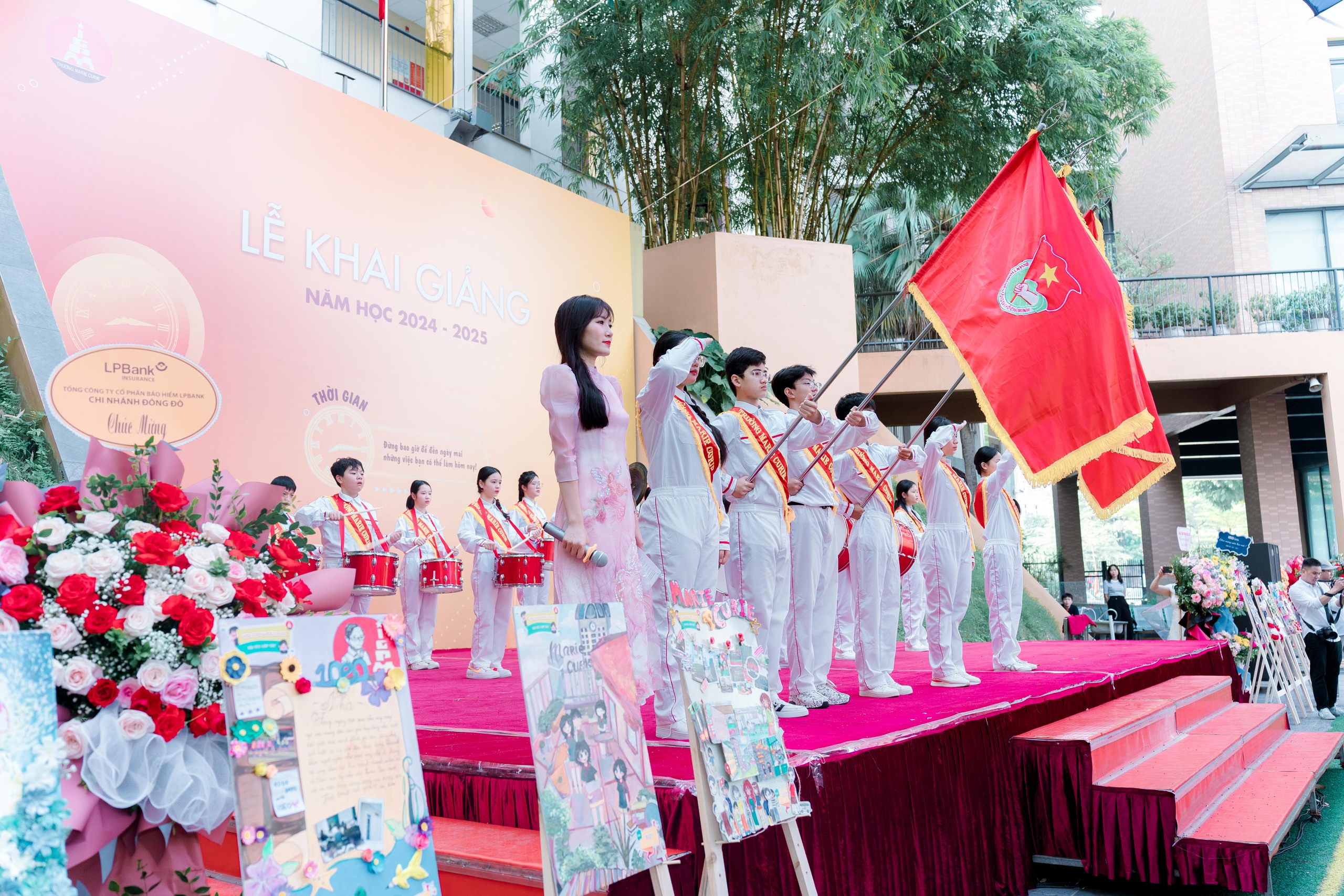 Tại trường Marie Curie cơ sở Mỹ Đình, không khí khai giảng cũng không kém phần sôi động. Các nghi thức trong buổi lễ đều diễn ra nhanh gọn, đơn giản nhưng vẫn ý nghĩa.