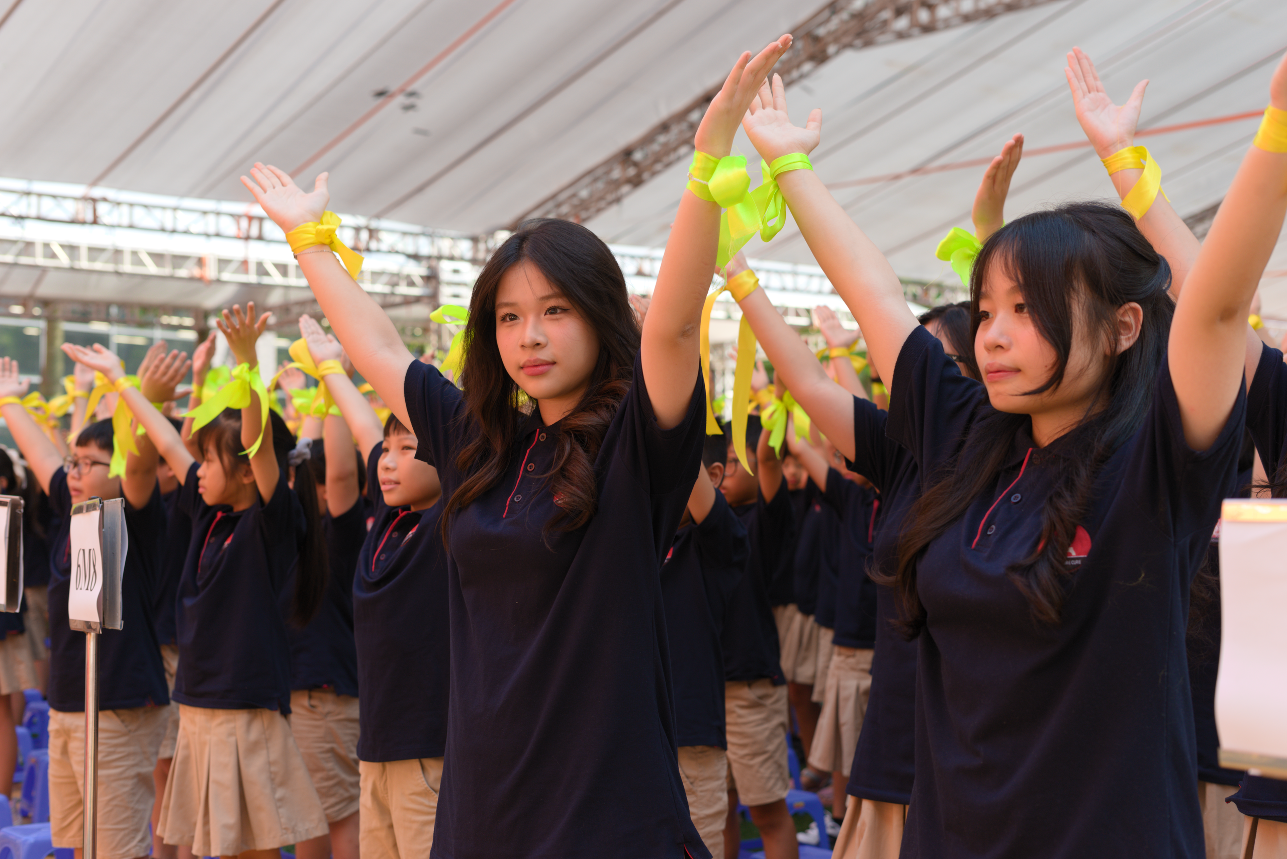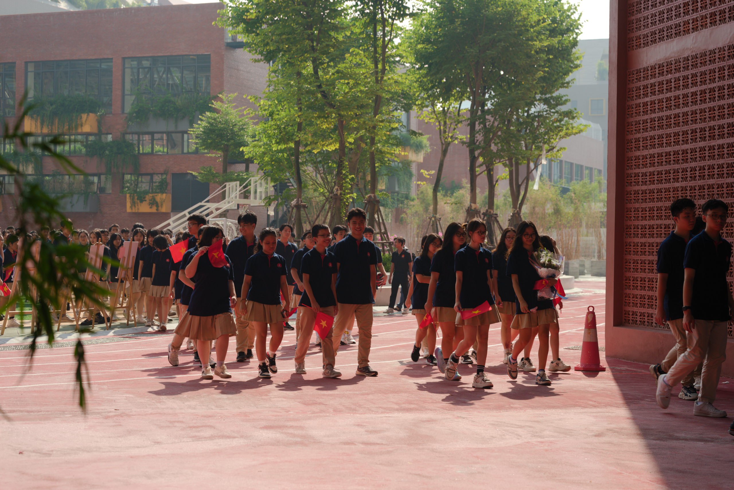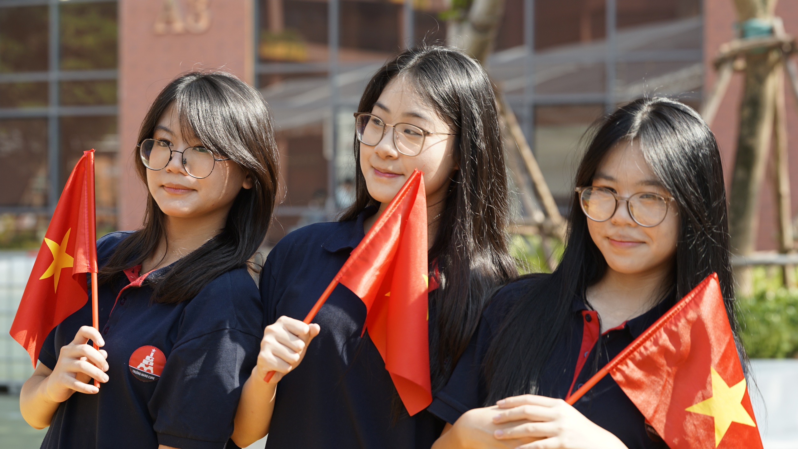 Tại trường Marie Curie cơ sở Mỹ Đình, không khí khai giảng cũng không kém phần sôi động. Các nghi thức trong buổi lễ đều diễn ra nhanh gọn, đơn giản nhưng vẫn ý nghĩa.