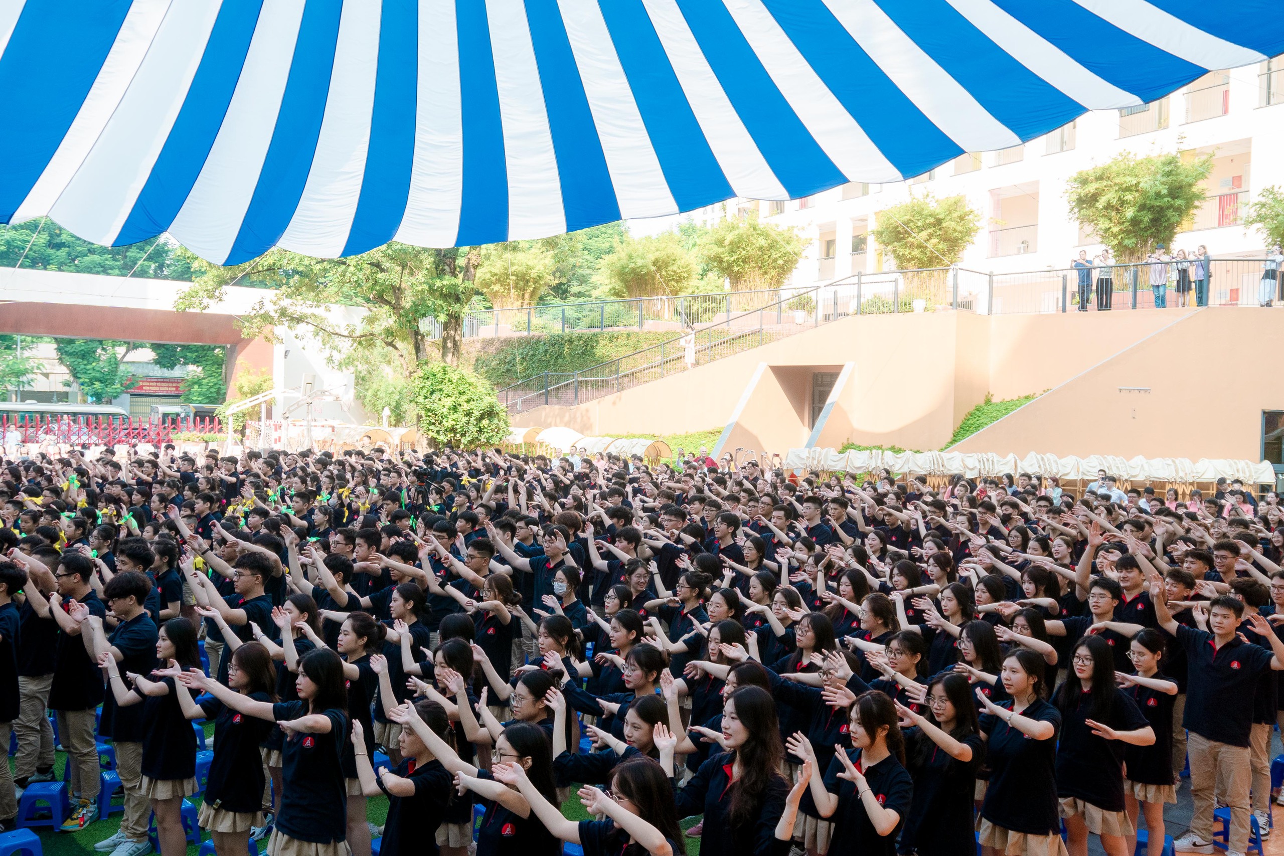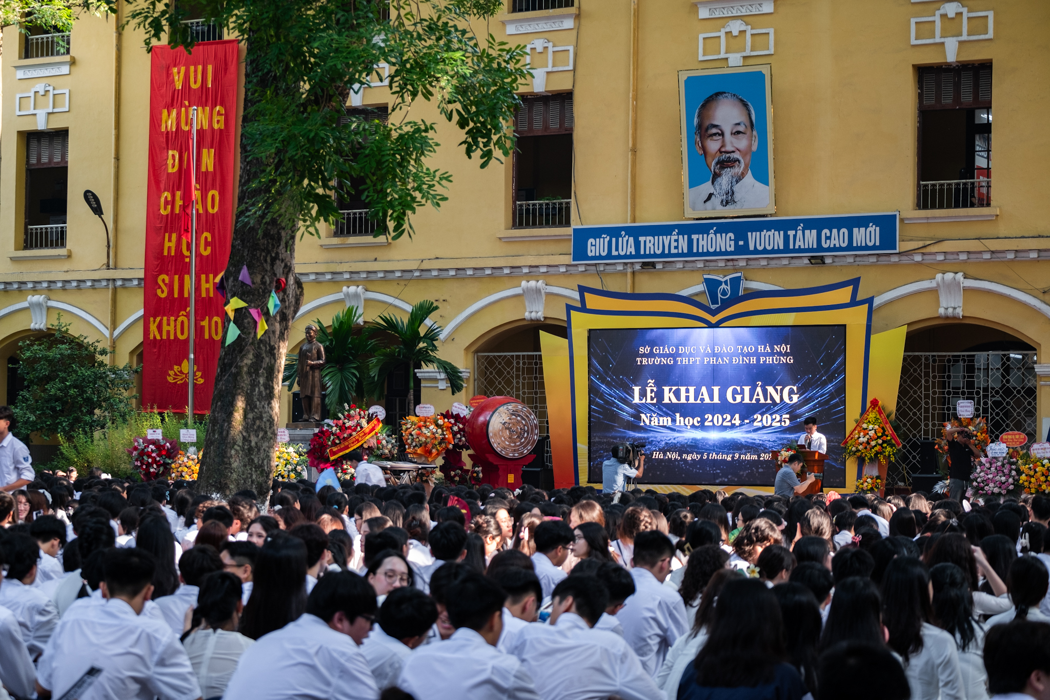 Tại “điểm cầu” THPT Phan Đình Phùng, các bạn học sinh có mặt từ sáng sớm để tham gia Lễ khai giảng năm học 2024 – 2025